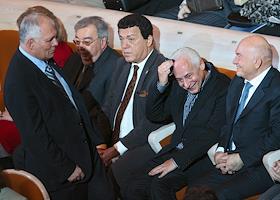 Певец Иосиф Кобзон (слева) и мэр Москвы Юрий Лужков (второй справа) на юбилейном концерте в честь…