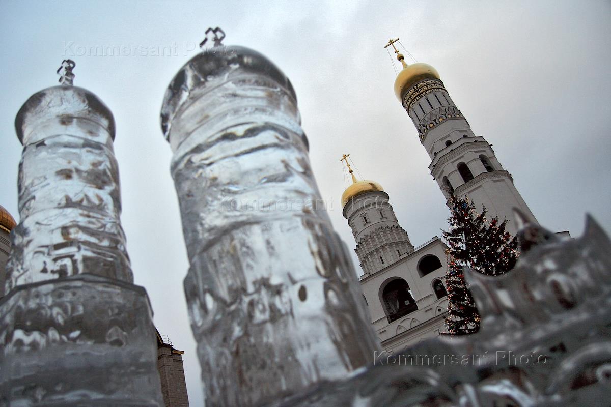 Новогодняя елка и ледяная скульптура на Соборной площади Кремля.