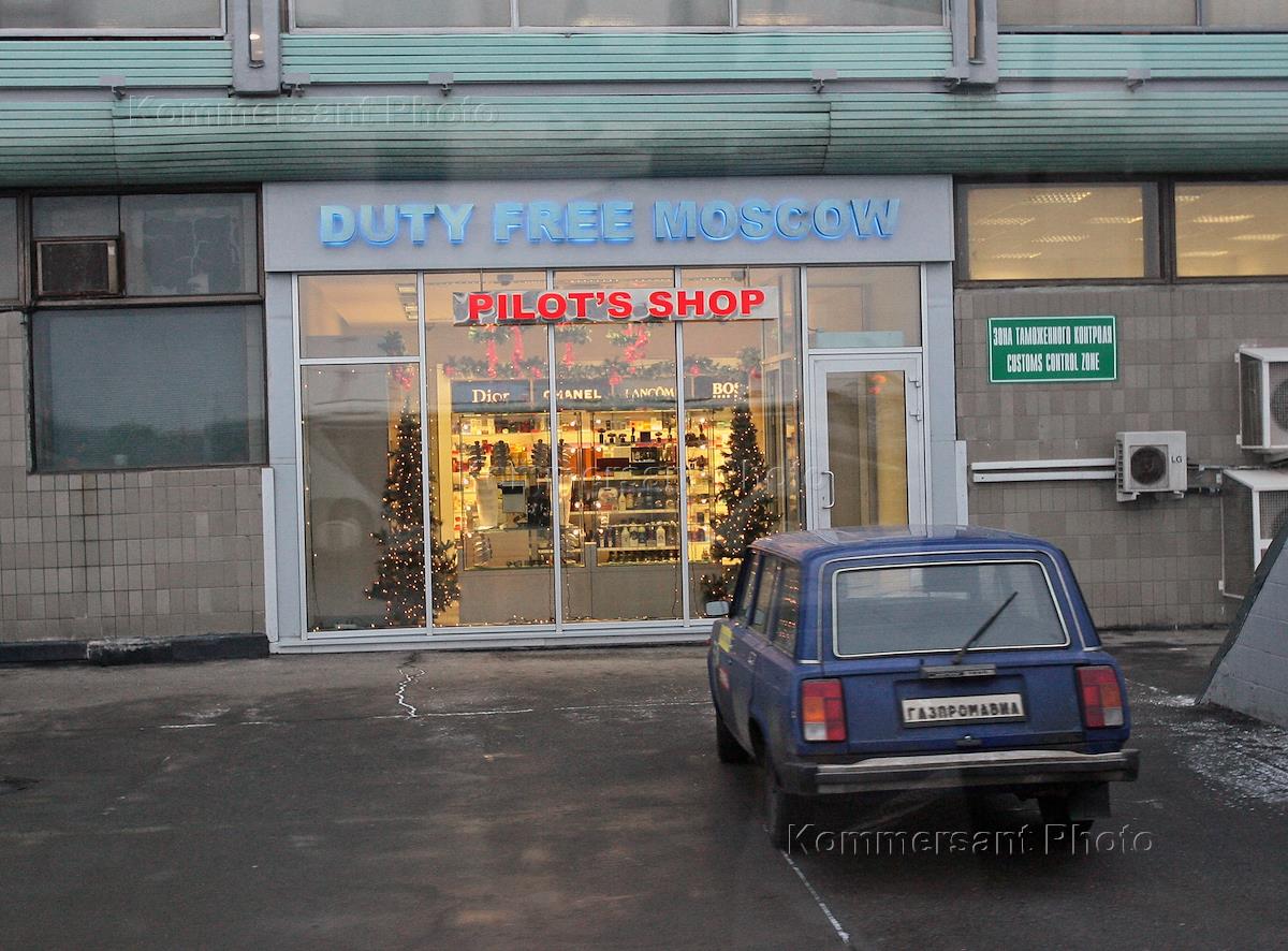 Аэропорт "Внуково". Магазин беспошлинной торговли Duty Free Moscow и надпись на стекле Pilot's Shop…