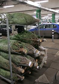 Перевозка живых елок перед продажей в торговом коплексе "Белая Дача".