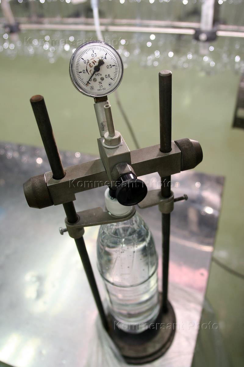 Производство минеральной воды "Сарова". Бутылка воды под прессом с манометром, измеряющим давление в…