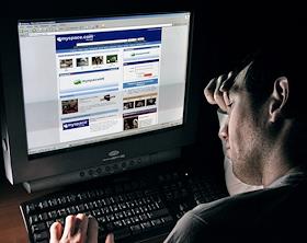 Человек за компьютером. На мониторе открыт сайт "Myspace.com.".