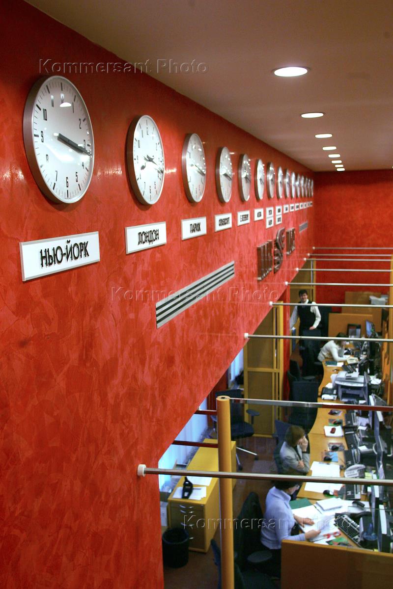 Часы с разными часовыми поясами в операционном зале Московской международной валютной биржи (ММВБ).