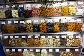 Сухофрукты и орехи на витрине ларька уличной торговли.