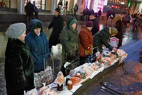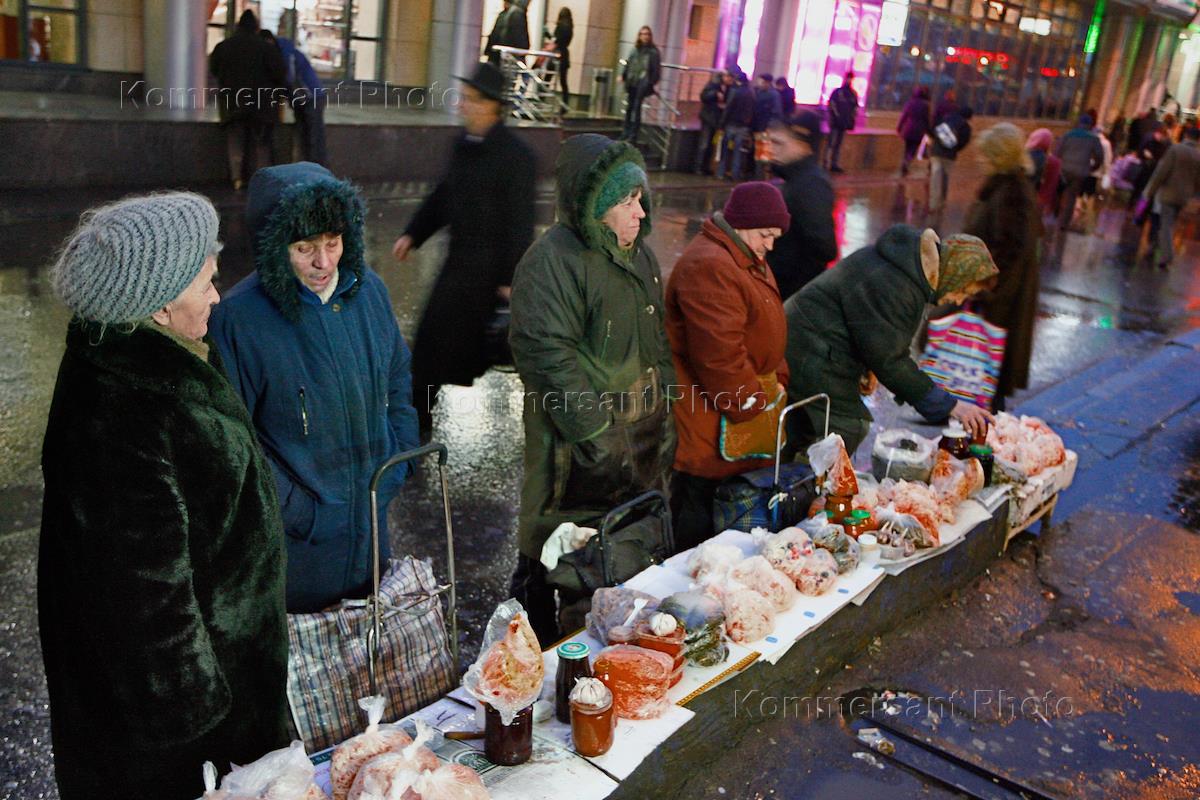 Уличная торговля. Пожилые женщины продают квашеную капусту и варенье у входа на станцию метро.