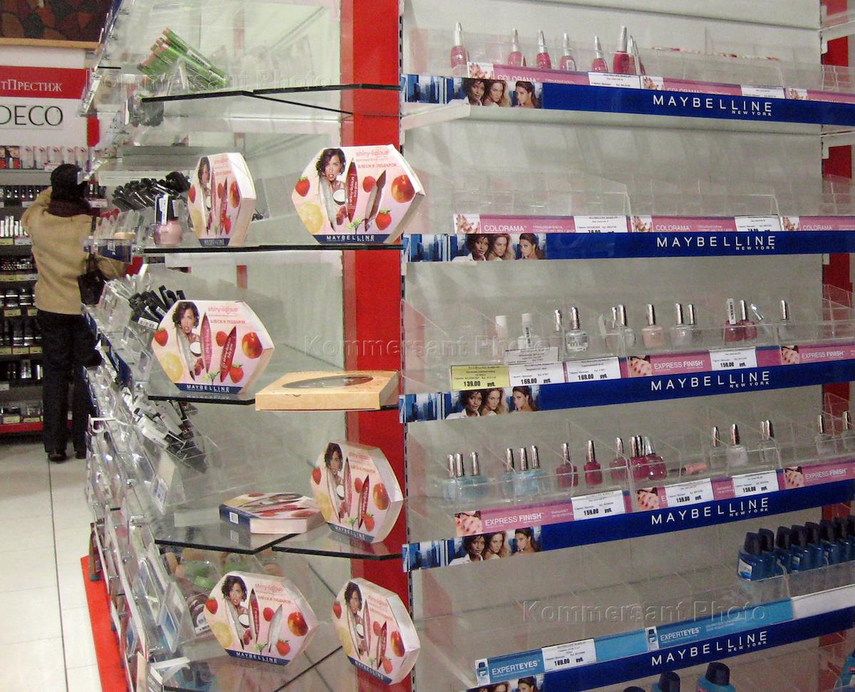 Покупательница перед пустой витриной в магазине "Арбат Престиж" на Соколе.