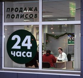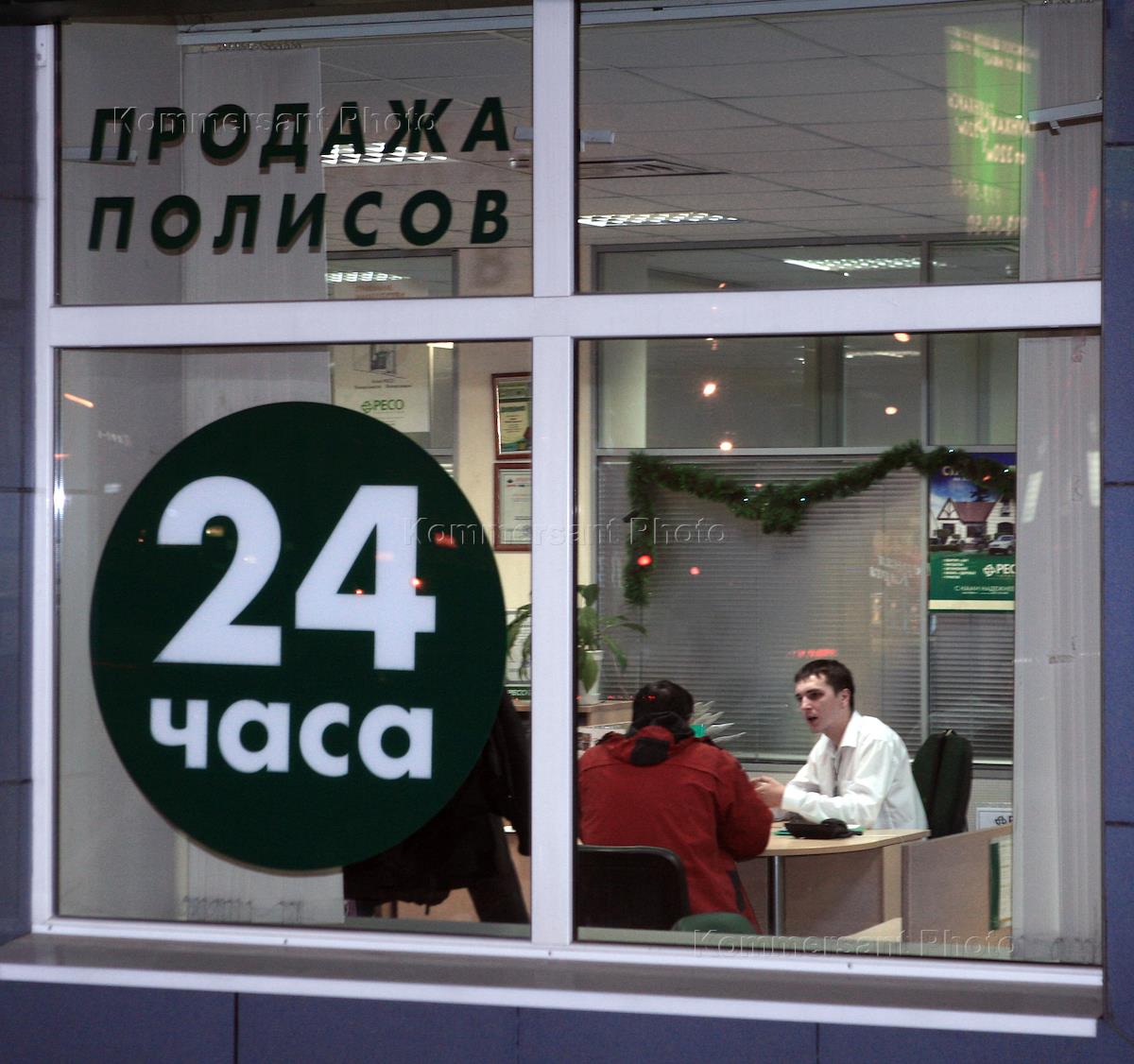 Реклама "Продажа полисов 24 часа" на оконном стекле офиса компании "Ресо гарантия" на Соколе.