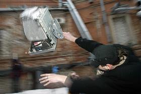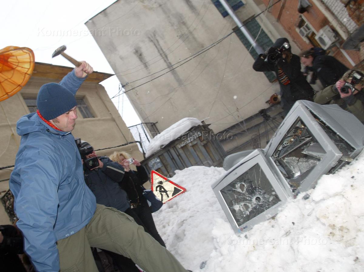 Акция художников - метание компьютеров на дальность. Участник акции разбивает экраны мониторов…