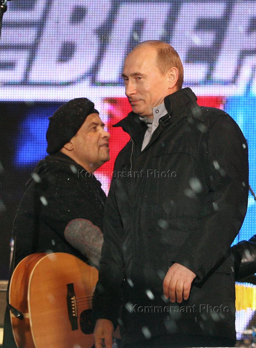 Лидер группы "Любэ" Николай Расторгуев (слева) и президент России Владимир Путин (справа) во время…