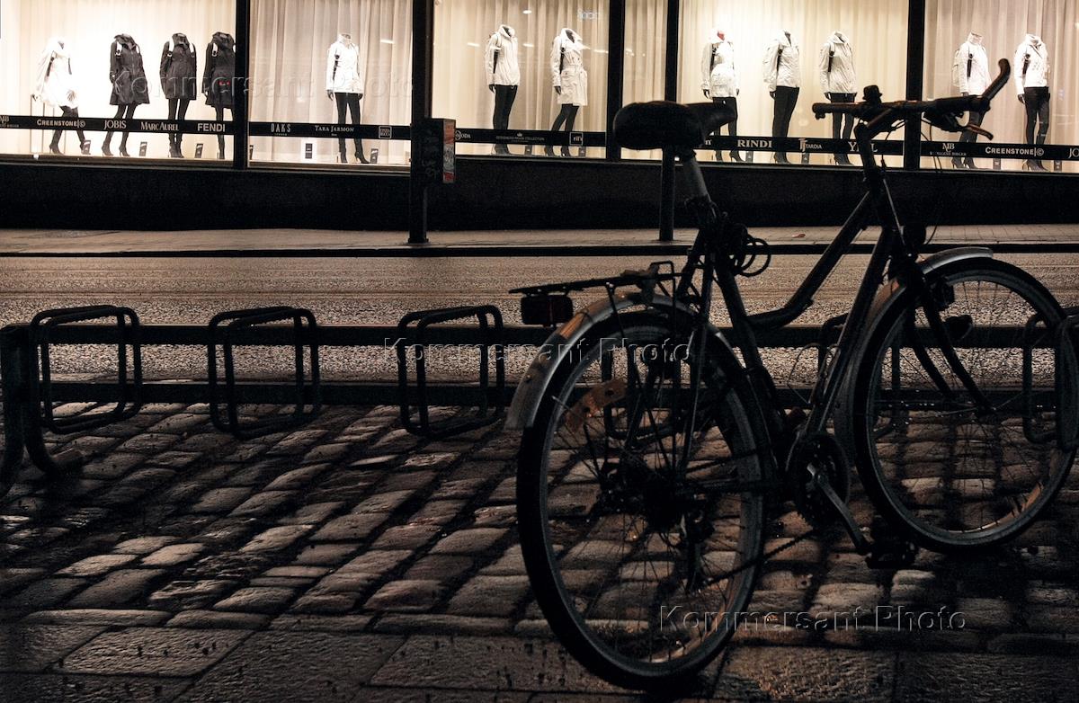 Вид города Хельсинки. Витрина магазина. Припаркованный на улице велосипед.