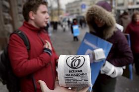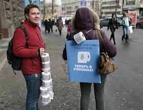 Промо акция у метро "Красные ворота", участники которой распространяли газету в виде рулонов туалетной бумаги.