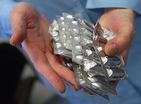 Производство медикаментов на ОАО "Нижфарм". Блистеры со свечами в руках упаковщицы.