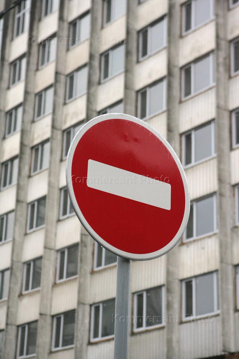 Дорожный знак "Въезд запрещен" ("Кирпич") на фоне здания Московского Пищевого комбината.