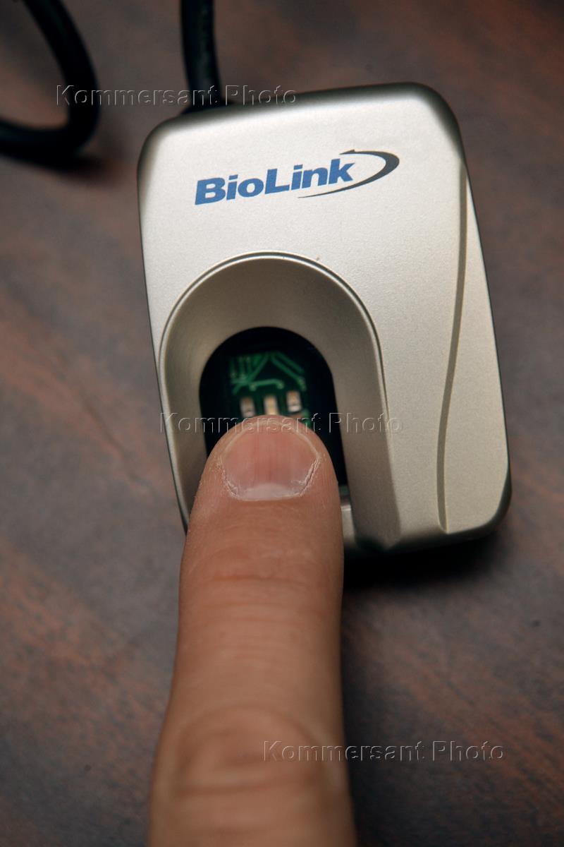 Сотрудник компании "Бипин" демонстрирует работу сканера BioLink, считывающего отпечатки пальцев.