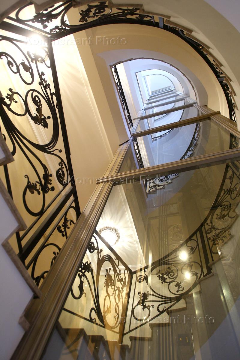 Лестница и застекленная лифтовая шахта элитного жилого дома.