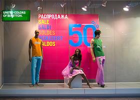 Витрина магазина "Бенеттон" (Benetton). Плакат с надписями "Распродажа", "Sale 50%".