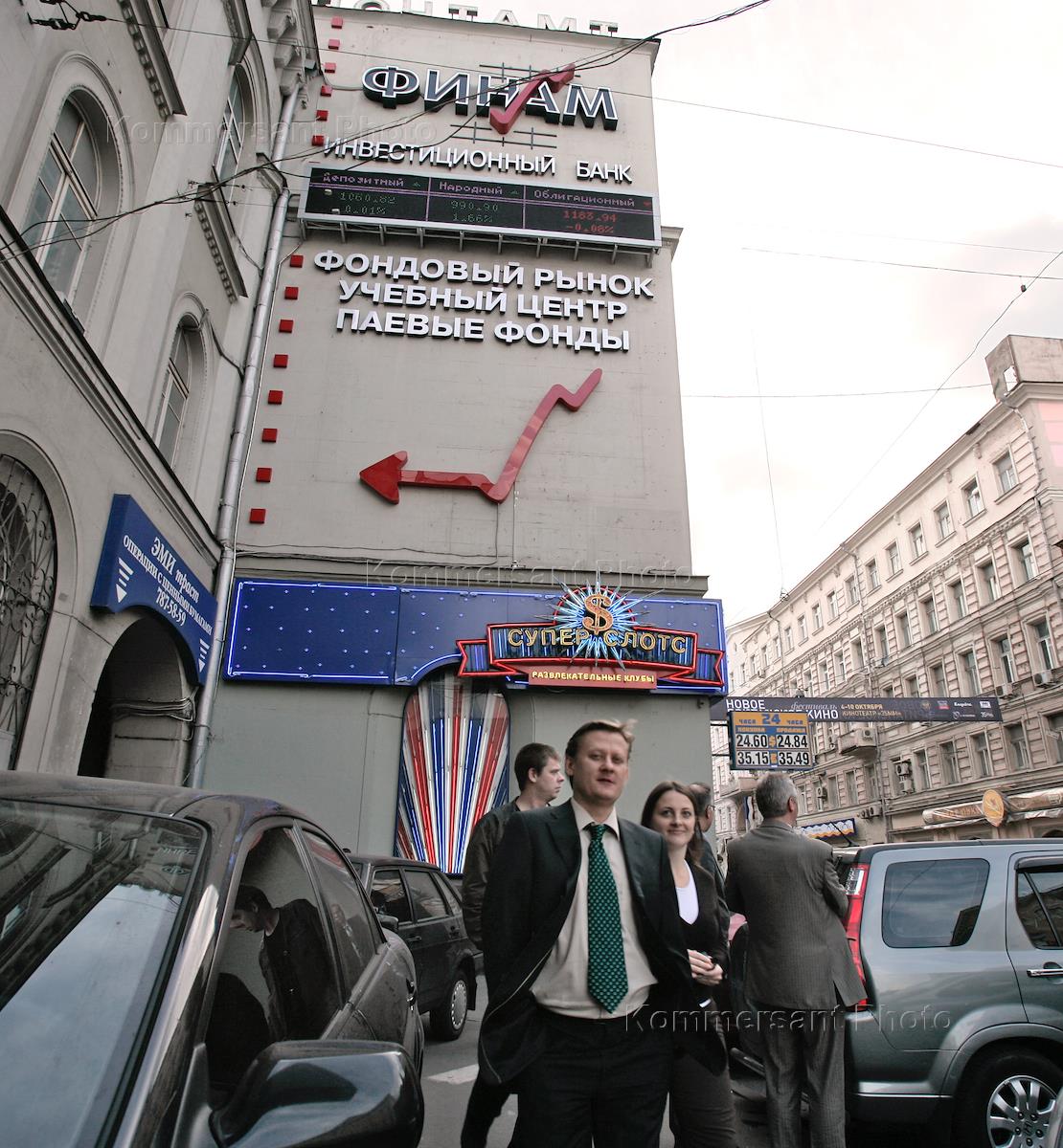 Указатель и вывеска Инвестиционного холдинга "Финам" на здании Почтамта.