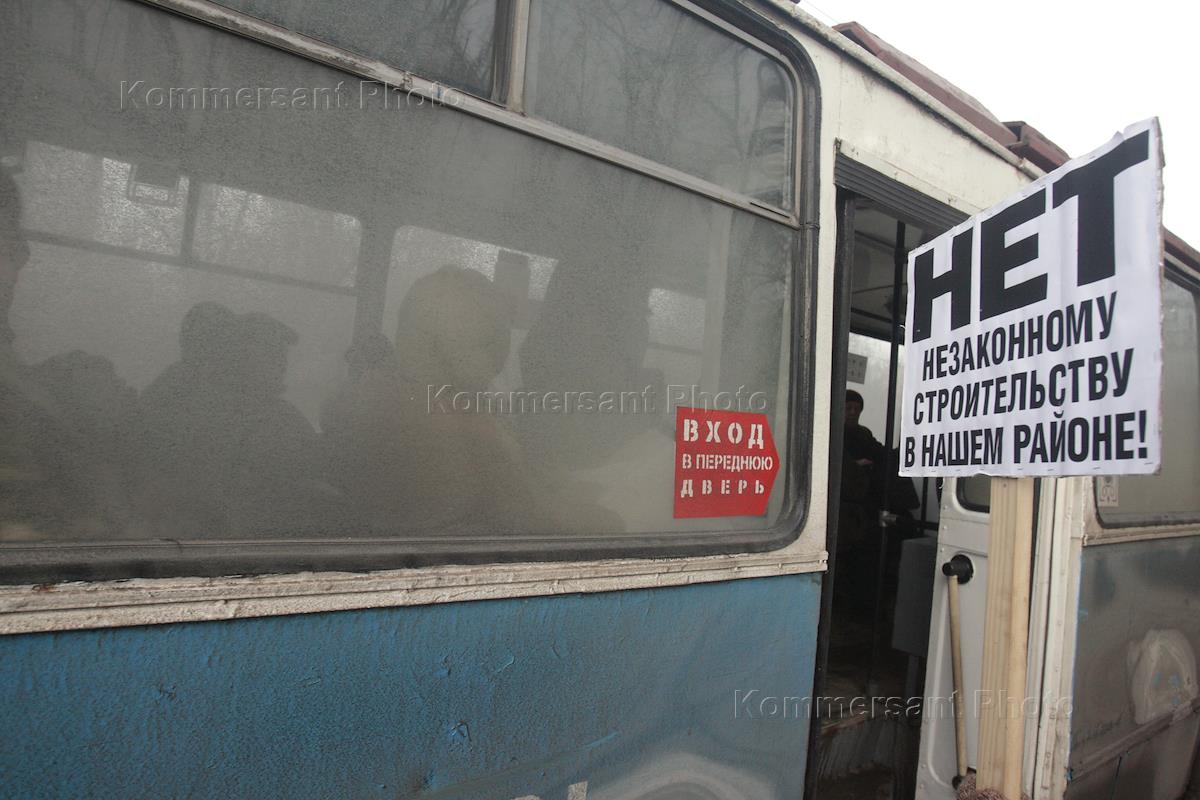 Корреспондент ИД "КомерсантЪ" Никита Аронов с плакатом "Нет незаконному строительству в нашем районе".