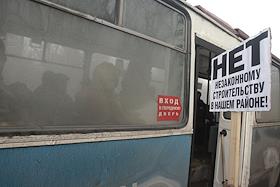 Плакат "Нет незаконному строительству в нашем районе" на автобусной остановке в районе поселка…