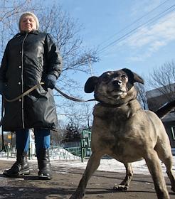 Старушка гуляет с собачкой в районе поселка Сокол.