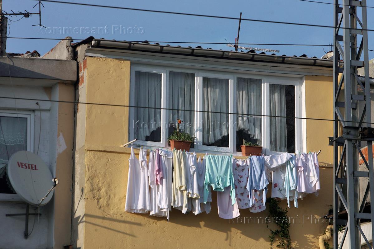 Виды города Стамбула. Сушка белья за окном в жилом доме.