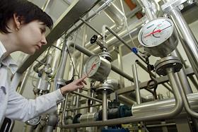Производственный цех пивоваренного завода "Волга". Оператор следит за показаниями приборов.