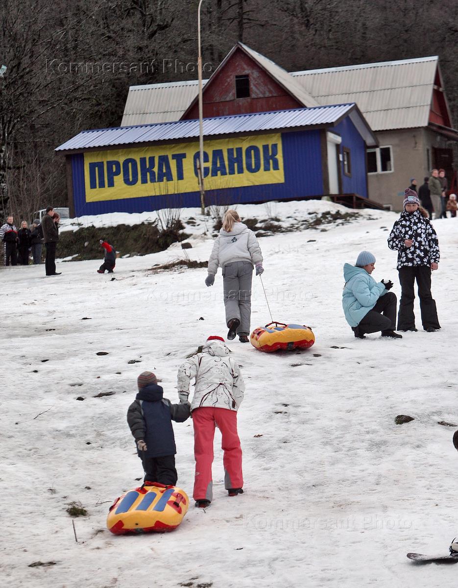 Отдыхающие с детьми на снежных склонах горнолыжного курорта "Красная Поляна ". Прокат санок.