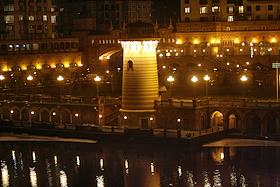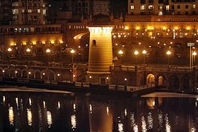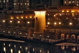 Маяк на набережной элитного жилого комплекса "Алые паруса" ночью.