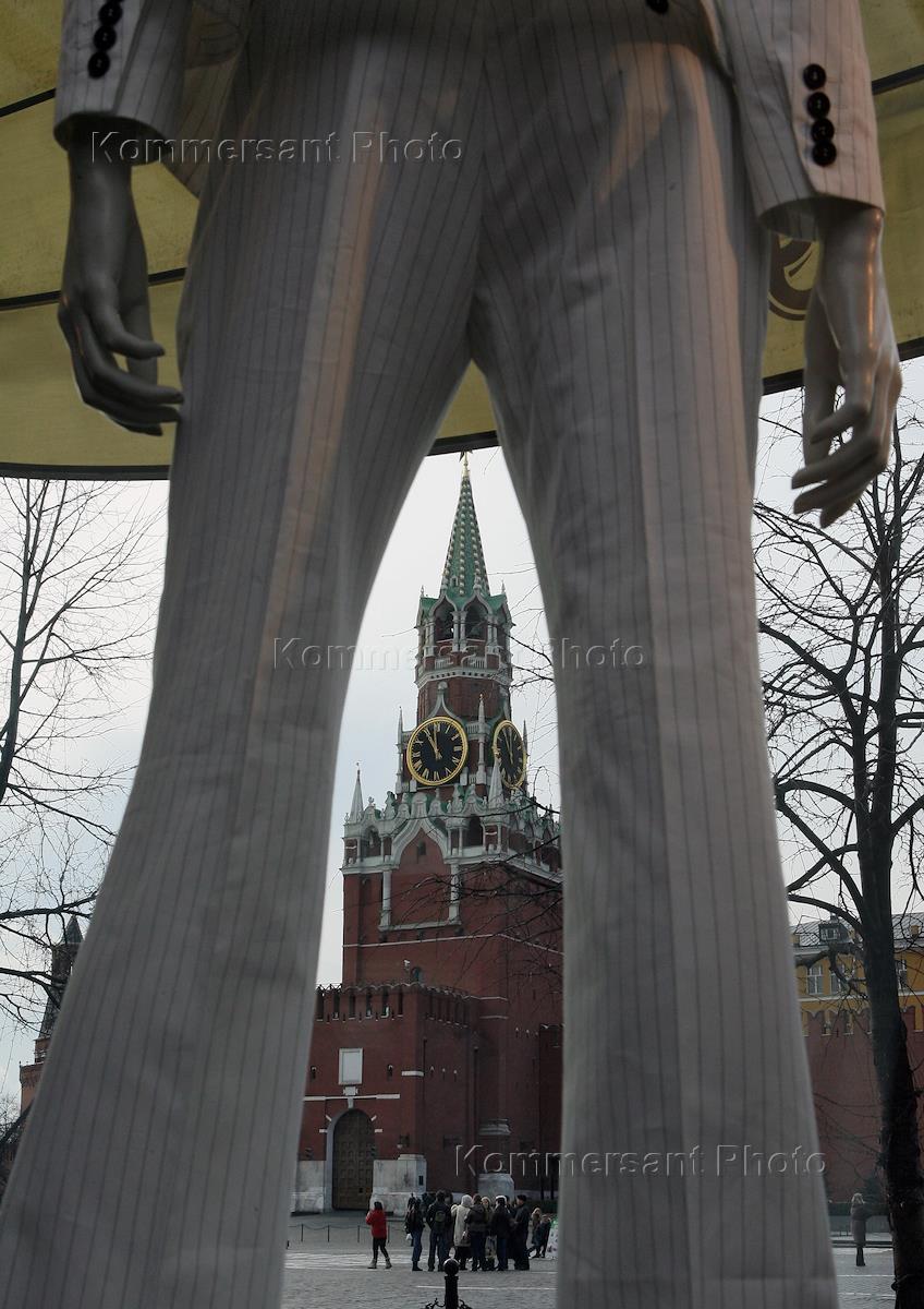 Спасская башня Московского Кремля сквозь витрину бутика "Paul Smith", расположенного в здании…