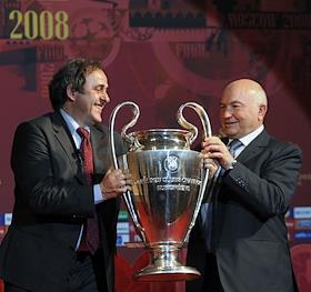 Президент УЕФА Мишель Платини (слева) на торжественной церемонии передал трофей Лиги чемпионов мэру…