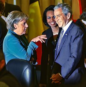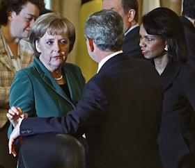 Саммит НАТО. Президент США Джордж Буш (справа) и федеральный канцлер Германии Ангела Меркель (слева)…