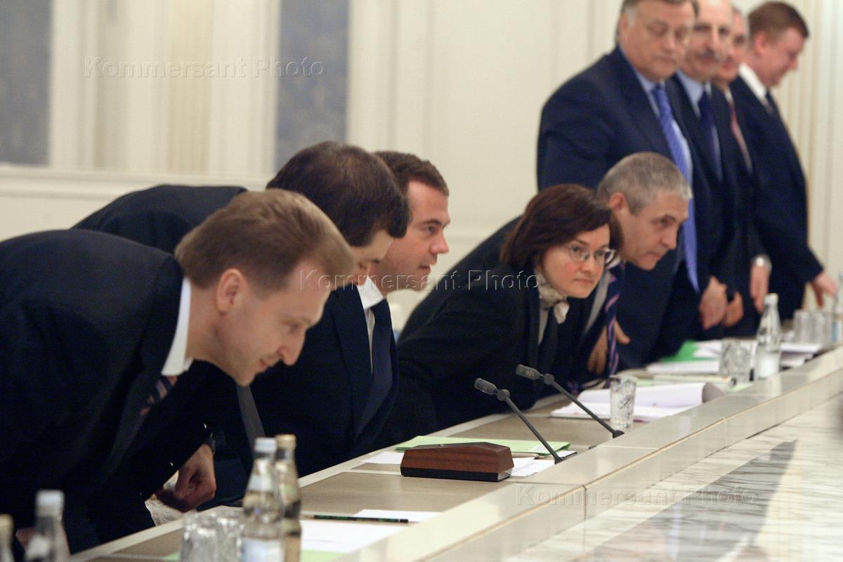 Экономика и бизнес Встреча вновь избранного Президента России Д.А.Медведева с членами бюро правления Российского союза промышленников и предпринимателей в Кремле.