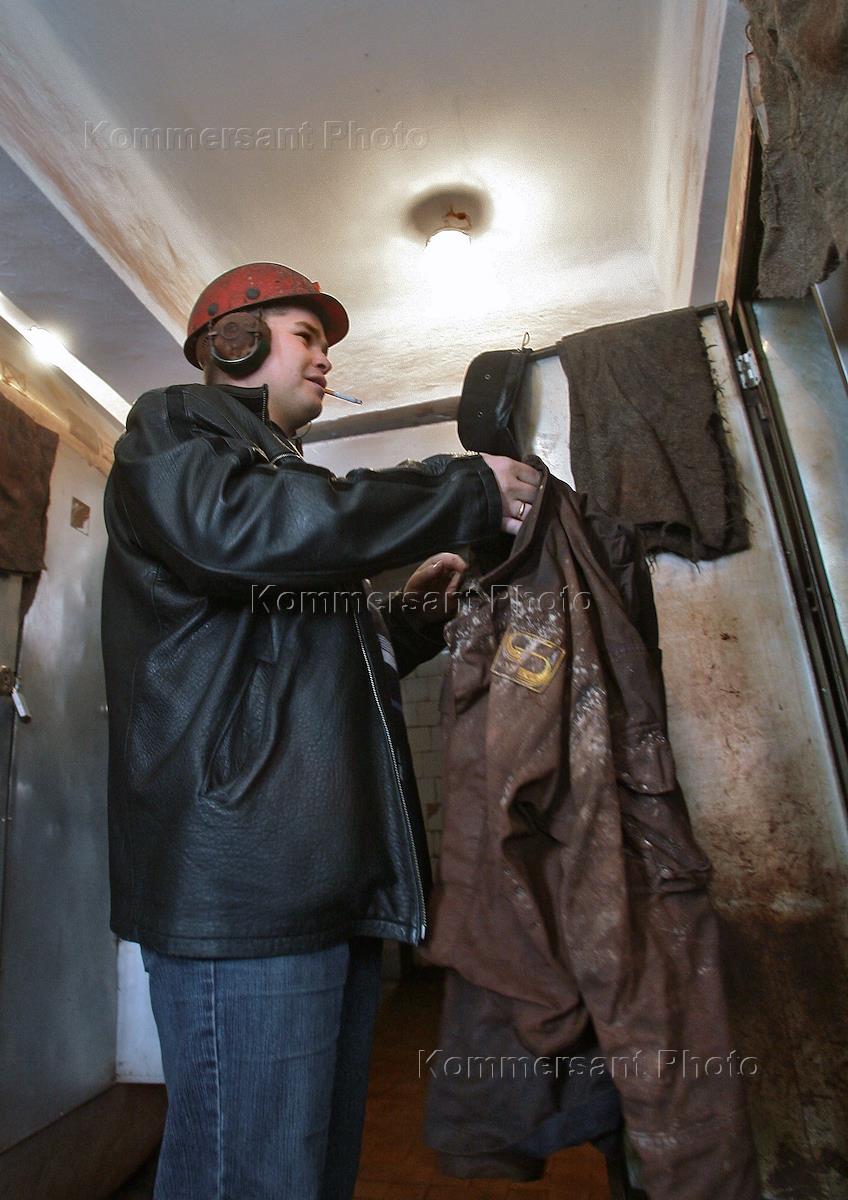 Рабочий в раздевалке бокситной шахты "Красная Шапочка" ОАО "Севуралбокситруда" (СУБР) в…