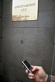 Человек с мобильным телефоном у здания Арбитражного суда города Москвы.