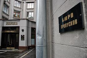 Виды Москвы. Здание Конституционного суда России. Вывеска "Бюро пропусков" на здании суда.