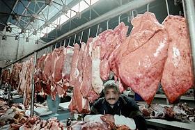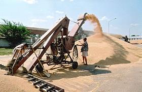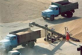 Уборка урожая. Люди на току загружают зерно в грузовые машины.