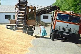 Уборка урожая. Люди на току загружают зерно из комбайна в грузовую машину.
