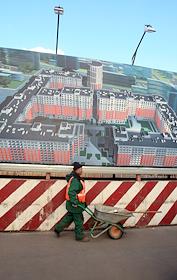 Работник коммунальных служб около ограждения строительной площадки жилого комплекса "Английский…