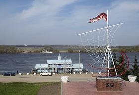 Набережная реки Оки и речной вокзал в городе Павлово. Стела с флагом и парусом.