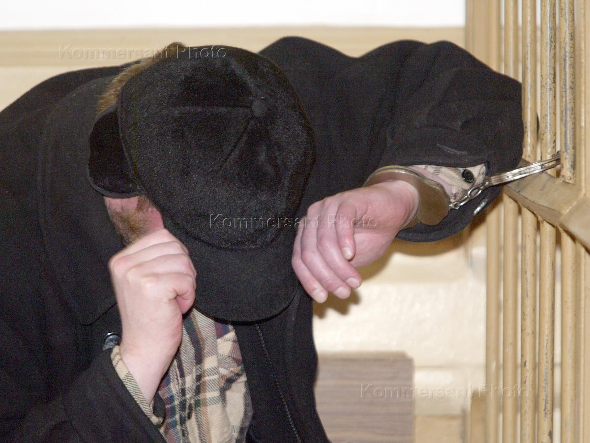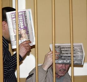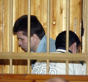Обвиняемые, участники "банды Абрамова", за решеткой во время заседания суда.