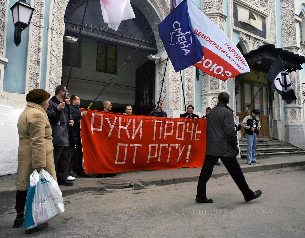 Экономика и бизнес Митинг "Против захвата здания РГГУ" провели активисты ОГФ, движений "Оборона", "Смена" и "Трудовая Россия". Они выразили протест выселения Российского государственного гуманитарного университета (РГГУ) из аудиторий в здании на Никольской улице. Акция проходила у здания РГГУ на Никольской улице.