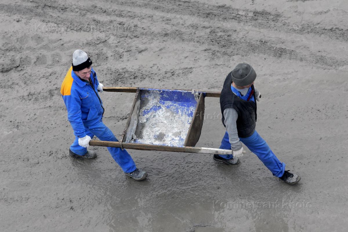 Рабочие с носилками на территории завода ООО "Промбетон".