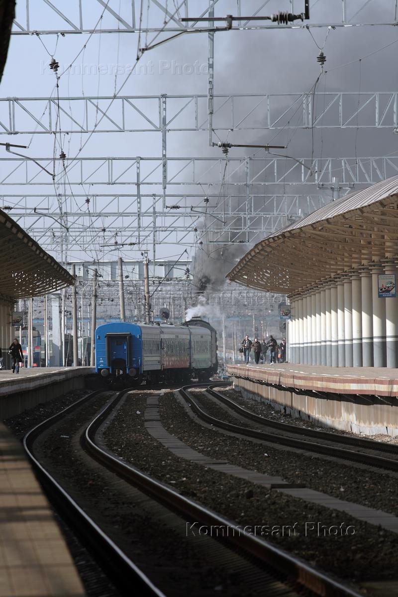 Перрон на железнодорожном Курском вокзале. Уходящий состав.