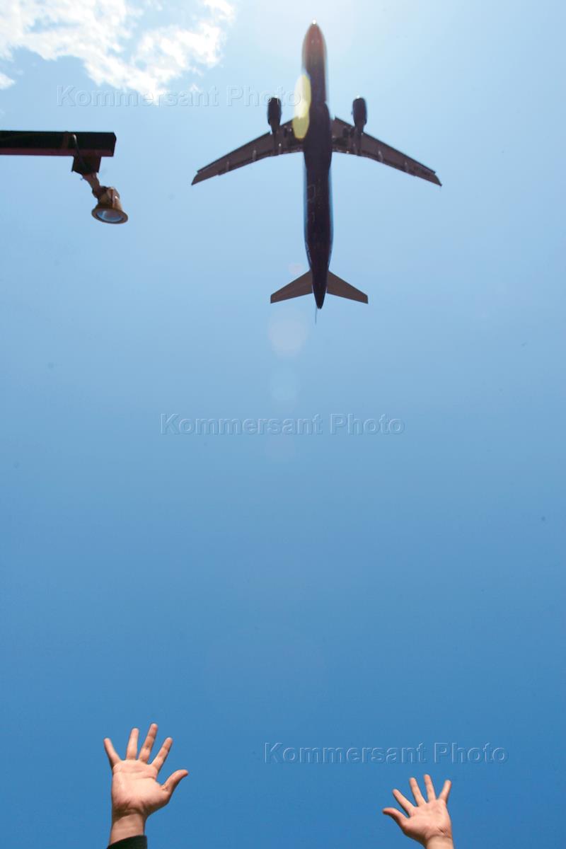Пассажирский самолет гражданской авиации в небе над аэропортом "Шереметьево".
