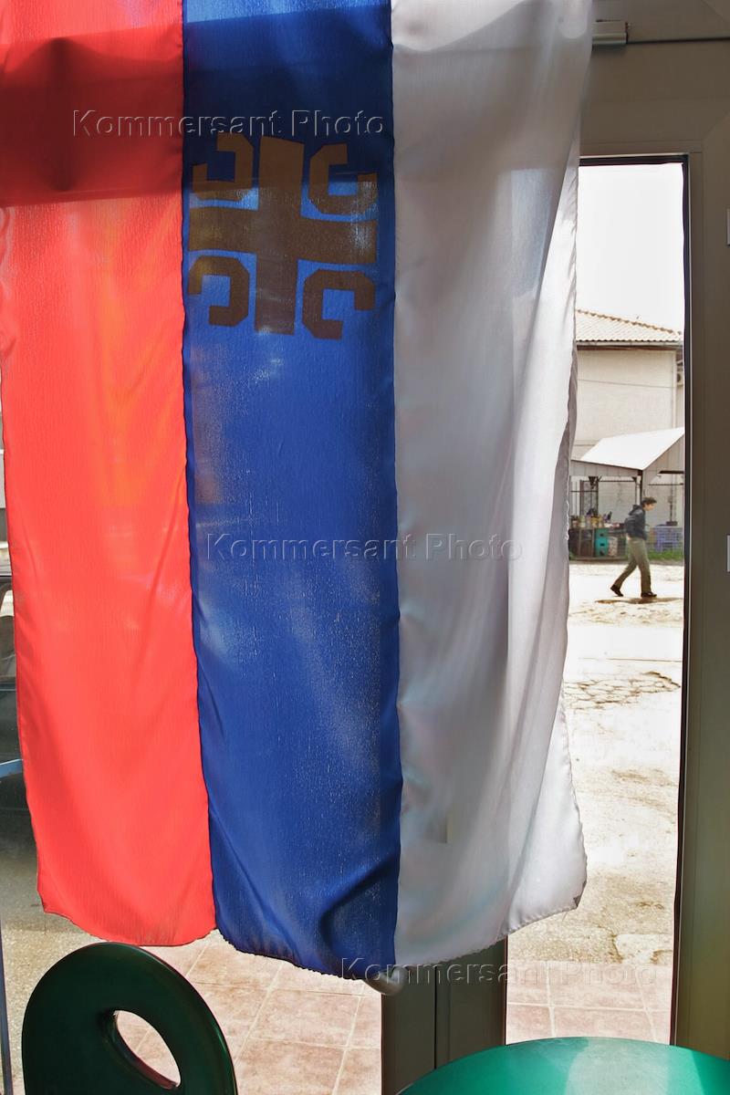 Сербский флаг, вывешенный в окне кафе в Митровицы.