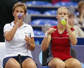 Российские теннисистки Лина Красноруцкая (слева) и Елена Дементьева (справа) пьют воду в перерыве…