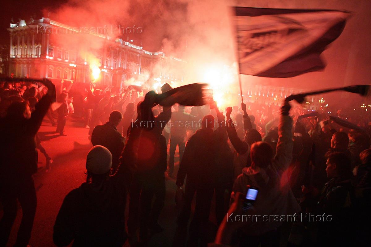 Празднование победы футбольной команды "Зенит"", выигравшей Кубок УЕФА. Ликующие болельщики на…
