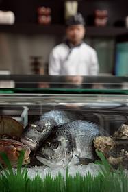 Свежая рыба в холодильной камере на кухне в ресторане "Yakimono".