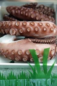 Свежий осьминог в холодильной камере на кухне в ресторане "Yakimono".