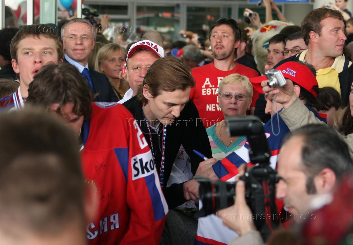 Торжественная встреча российской сборной, победившей в Чемпионате мира по хоккею. Капитан команды…